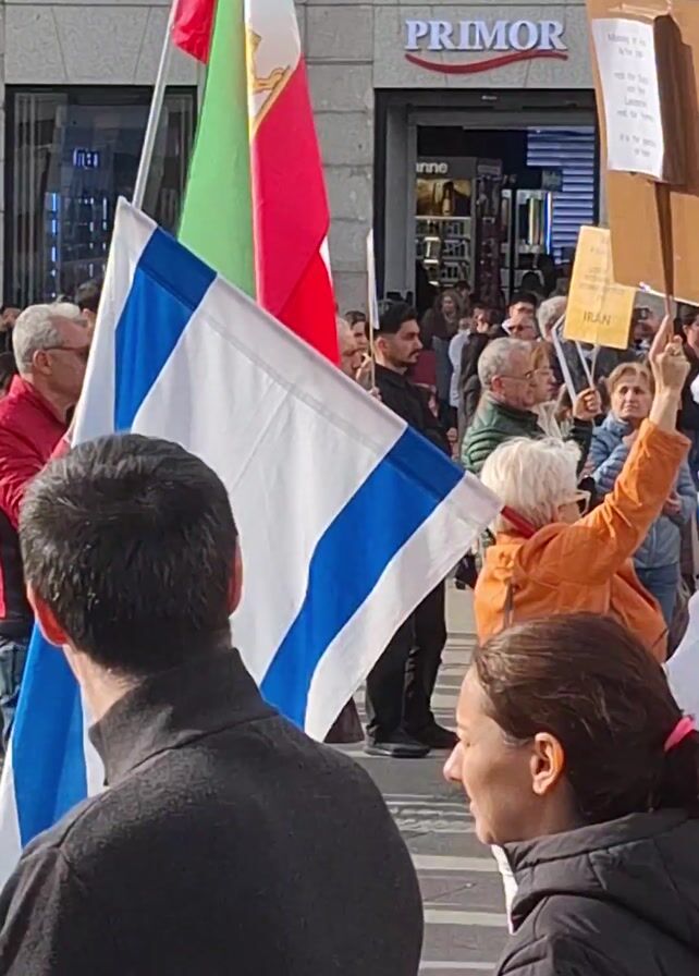 The video depicts a protest gathering. People are holding flags, including the flags of Israel, the United States, and Iran. Some protesters also hold signs. A woman with a microphone appears to be speaking. A large Iranian flag with images is displayed behind her. A group of children sit near the Iranian flag. The gathering takes place in a public square. The shops “PRIMOR” and “PALAZZO” are visible in the background.