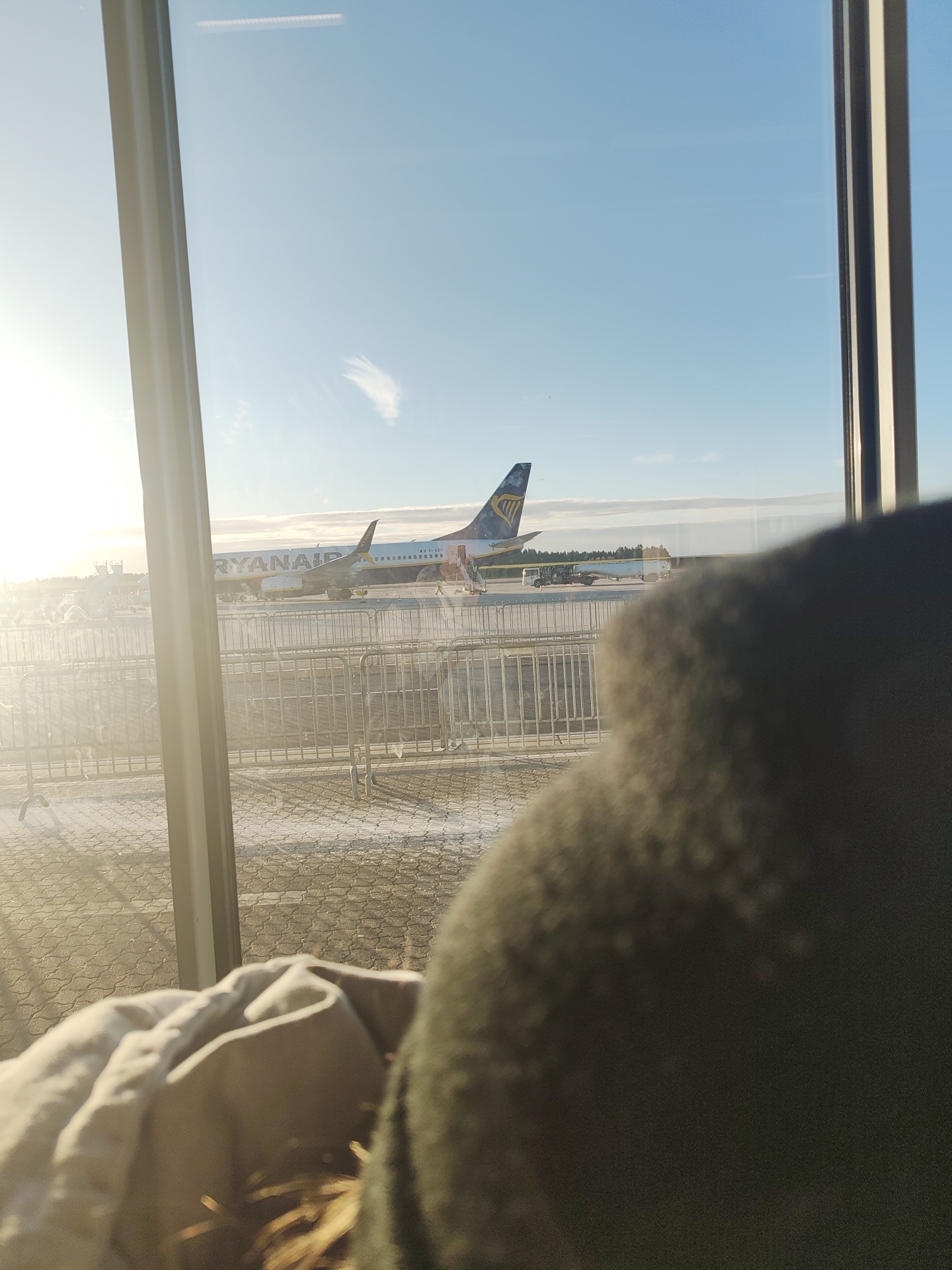 The image depicts an outdoor airport tarmac scene viewed from inside a building, likely a terminal, at Frankfurt-Hahn Airport in Lautzenhausen, Germany. The sky is clear blue with minimal scattered white clouds and a high-altitude contrail. Intense sunlight emanates from the left, creating significant glare on the window. A white and blue Ryanair Boeing 737 aircraft, bearing the registration "EI-EBJ" on its fuselage, is parked on the paved tarmac. The aircraft's fuselage features "RYANAIR" in blue lettering, and its tail fin displays the airline's blue, white, and yellow logo. A mobile set of passenger stairs is connected to the aircraft's mid-aft door. Additional ground support equipment, including what appears to be a tanker truck, is visible beyond the aircraft's wing. The tarmac ground surface is patterned, suggesting paving stones or asphalt, and shows patches of white material consistent with snow or frost. Grey metal crowd control barriers are horizontally arranged across the tarmac between the viewing window and the aircraft. The foreground includes elements from the viewer's immediate surroundings: a blurry, dark, rounded object in the lower right quadrant, consistent with a person's shoulder and head. In the lower left, a folded beige garment and strands of brown hair are visible. A light-colored vertical window mullion extends from the top to the bottom of the frame on the left side, partially bisecting the view. Distant trees are visible on the horizon beyond the tarmac.