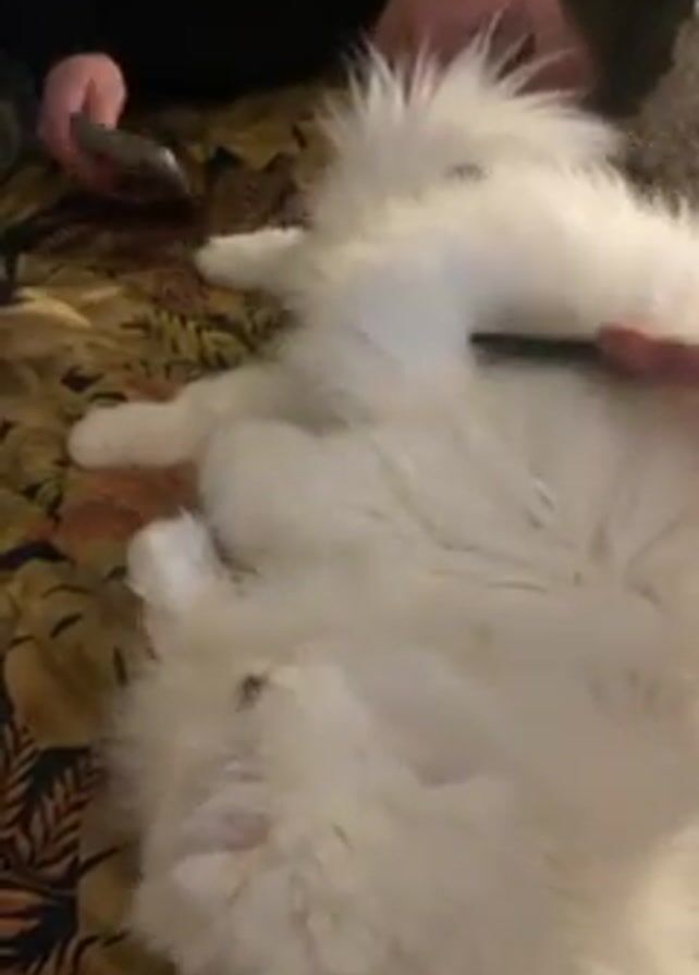 The scene features a long-haired white cat lying on its back on a patterned bedspread. A person is lying beside the cat, looking at their phone. Another person is holding a black comb and gently combing the cat's fur. The comb is being used to brush the cat's belly fur.