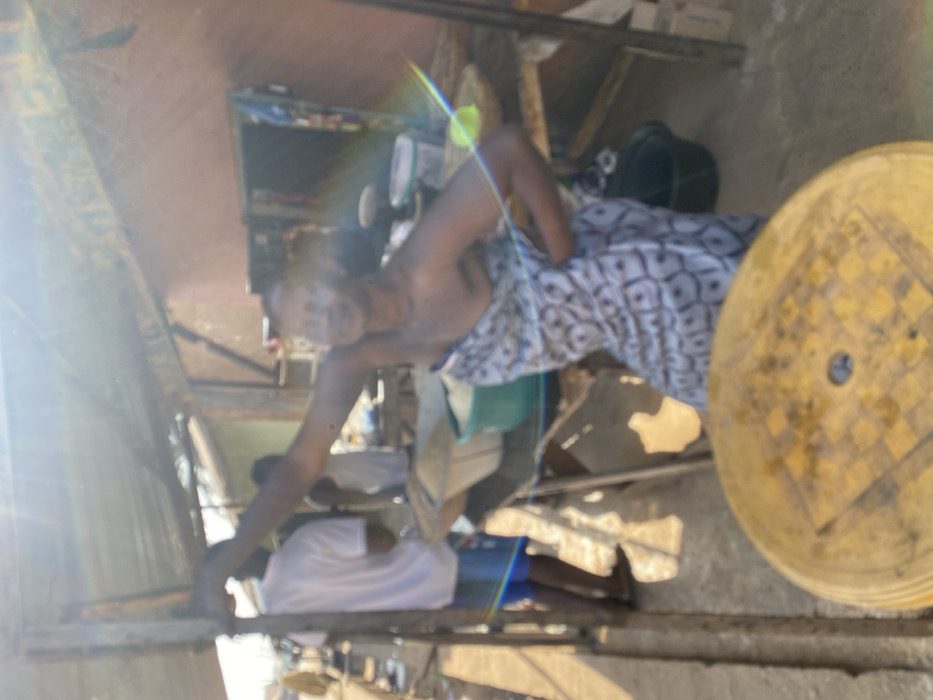 The image depicts an outdoor market setting in Sabon Gari Nassarawa, Nigeria. The central subject is an adult female, dark-complexioned, wearing a patterned wrapper (white/grey geometric design) covering her lower torso and chest, exposing her shoulders. She leans her left arm on a wooden support beam of a makeshift stall structure, with her right hand positioned on her hip, and is looking towards the camera with a slight smile. Behind her, a wooden market stall counter holds various containers, including a shallow woven basket and a turquoise plastic basin, both containing a white granular substance. Other indistinct containers are also present. Two other adult males are visible in the background: one on the left, seen from behind, wearing a white t-shirt and blue shorts; another is partially obscured behind the counter, wearing a white garment. The scene operates under a temporary shelter constructed with wooden posts and a tarp-like roof. A reddish-brown structure forms the background wall. In the immediate foreground, a circular yellow plastic stool or low table with a grid pattern and a central hole is visible, exhibiting wear. The ground surface is paved, with a visible drainage channel or raised edge on the left. The scene is illuminated by bright daylight, characterized by prominent lens flare.