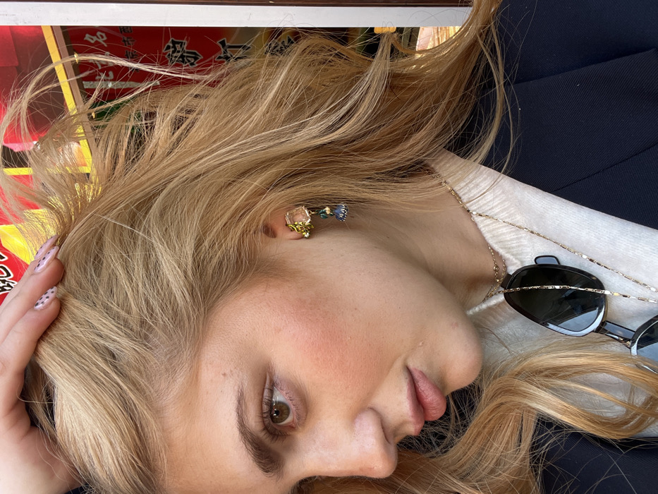 The image displays a close-up, profile view of a fair-skinned individual with long, wavy blonde hair, facing left. A left hand, featuring manicured nails with light pink polish and dark speckles, is positioned at the top of the frame, appearing to touch the hair near the scalp. The individual has brown eyes, a straight nose, and light pink, closed lips. A noticeable blush is present on the right cheek. The right ear is adorned with a dangle earring featuring a square, light pink gemstone at the top, a green accent, and two blue, bell-shaped or floral-like components below. Multiple thin, gold-toned necklaces, including one with small rectangular links, are visible around the neck. Dark-lensed sunglasses with black frames are suspended from the neckline, resting on a light-colored, high-necked sweater. A dark-colored blazer is worn over the sweater. The background is blurred but reveals bright red and yellow commercial signage with visible Chinese characters. Recognizable characters include "賣" (mài, sell), "醬" (jiàng, sauce/paste), "名" (míng, name/famous), "一" (yī, one), and partially visible "竹" (zhú, bamboo). This setting indicates a commercial street or market environment, located within Xicheng District, China.