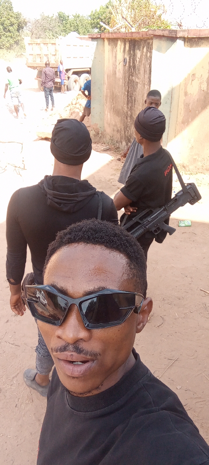 The image depicts an outdoor scene in Ayale, Nigeria, characterized by an unpaved, dusty ground and bright daylight conditions. In the immediate foreground, a dark-skinned male with short, curly hair and a mustache is taking a selfie, wearing a black t-shirt and dark, wraparound sunglasses which reflect a white vehicle. Behind him, slightly to the left, another dark-skinned male is visible from the back, wearing a black long-sleeve hooded top and a black head covering. To his right, a third dark-skinned male is also seen from the back, wearing a black t-shirt with red lettering, a black head covering, and carrying a black bullpup-style firearm, possibly a shotgun, slung over his right shoulder with the muzzle pointed downwards. Further into the midground and background, additional individuals are present. On the left side of the scene, a large, light-colored dump truck with a raised bed is visible. Around the truck, three men are present: one in a light green shirt and shorts walking towards the truck, another in a plaid shirt and jeans standing near the truck's rear, and a third in a blue shirt partially obscured. On the right, a weathered, light-colored concrete wall topped with barbed wire runs vertically, with a dark-skinned male in a light gray top partially visible behind it. The overall environment appears to be a semi-urban or rural street.