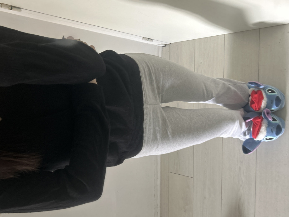 The image depicts an indoor scene in Cachan, France, featuring a person from the mid-torso down, standing on a light-colored plank floor. The subject wears a black long-sleeved top or sweater with a visible ribbed hem, paired with light grey sweatpants. On their feet are two blue plush slippers designed to resemble the character Stitch, each adorned with a small red Santa hat. The person's arms are bent, with hands not clearly visible; the left hand shows dark nail polish. The environment consists of white walls, a white baseboard along the left wall, and a partial white door or door frame on the right side. The lighting is uniform, suggesting an interior room, likely residential.