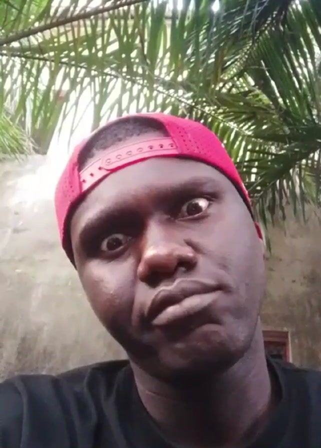 A man wearing a red baseball cap and a black T-shirt looks into the camera. He is outside, with palm fronds visible in the background. The man has dark skin and is making a face, pursing his lips and widening his eyes. A grey wall is behind him.
