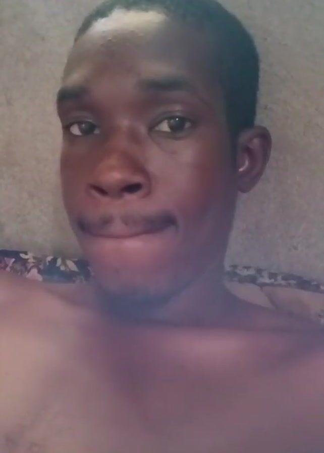 close-up shot of a dark-skinned man with short black hair and a slight mustache. He is shirtless and appears to be lying down, as a patterned fabric is visible beneath his shoulders. The background is a plain, light-colored wall or surface. The man is looking directly at the camera with a neutral expression, and his lower lip is slightly tucked in.