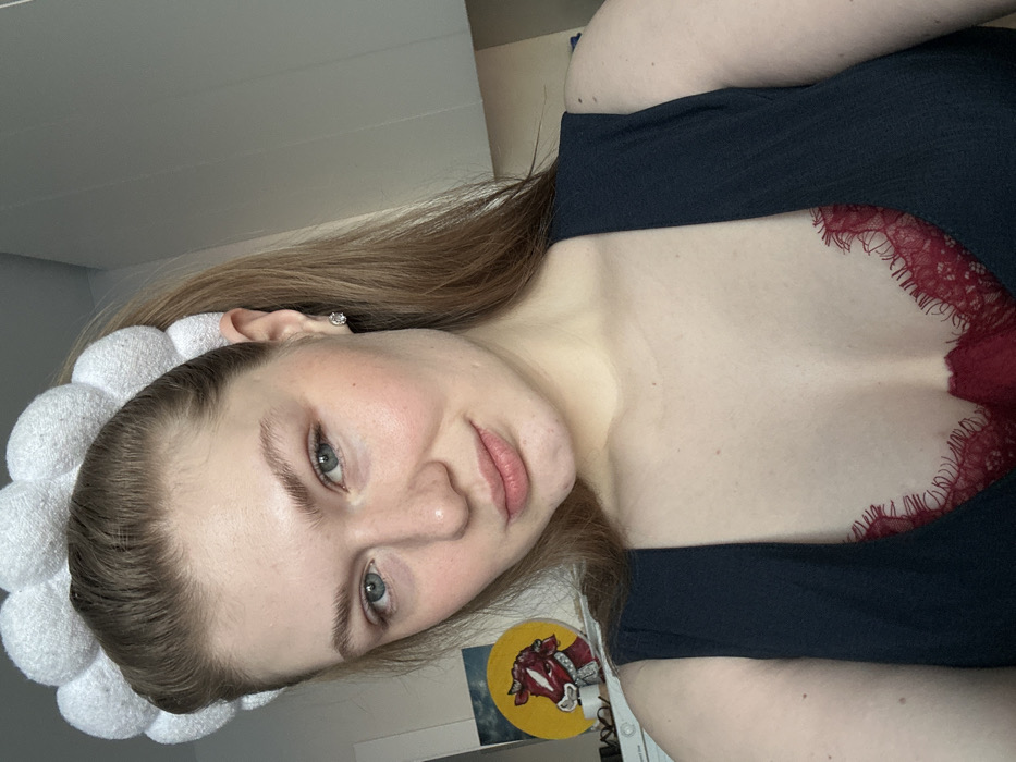 A fair-skinned woman with light brown hair and blue eyes poses with her head tilted. She wears a white, puffy headband. She has a black top with a red lacy undergarment peeking through. The background includes a light-colored wall, a small circular object with a cow on it, and other indistinct objects. The lighting is soft and diffused.