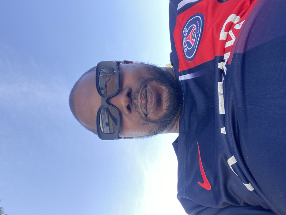 A man with sunglasses and a beard looks up at the sky. He wears a Paris Saint-Germain jersey with a red and blue color scheme, showcasing the team's logo on the chest. The jersey also features a Nike swoosh. The sky is a clear, light blue, providing a vibrant backdrop. The photo is taken from a low angle.