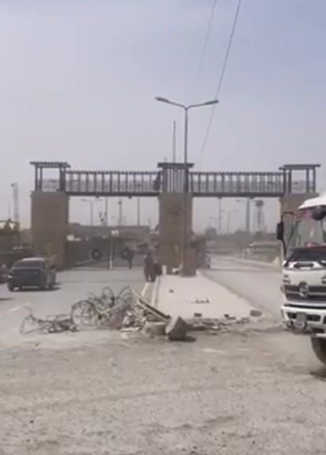 desert landscape with a fortified entrance gate in the background. The gate is constructed of light brown stone with a decorative wrought-iron overhead section. In front of the gate, there's a pile of debris, including concrete blocks and barbed wire, partially blocking the road. A white semi-truck with a green cargo container pulls into the frame from the right and stops alongside the road. A white pickup truck is parked nearby on the left. The sky is overcast with hazy sunlight. Dust particles float in the air. There are a few people visible near the gate and in the distance.