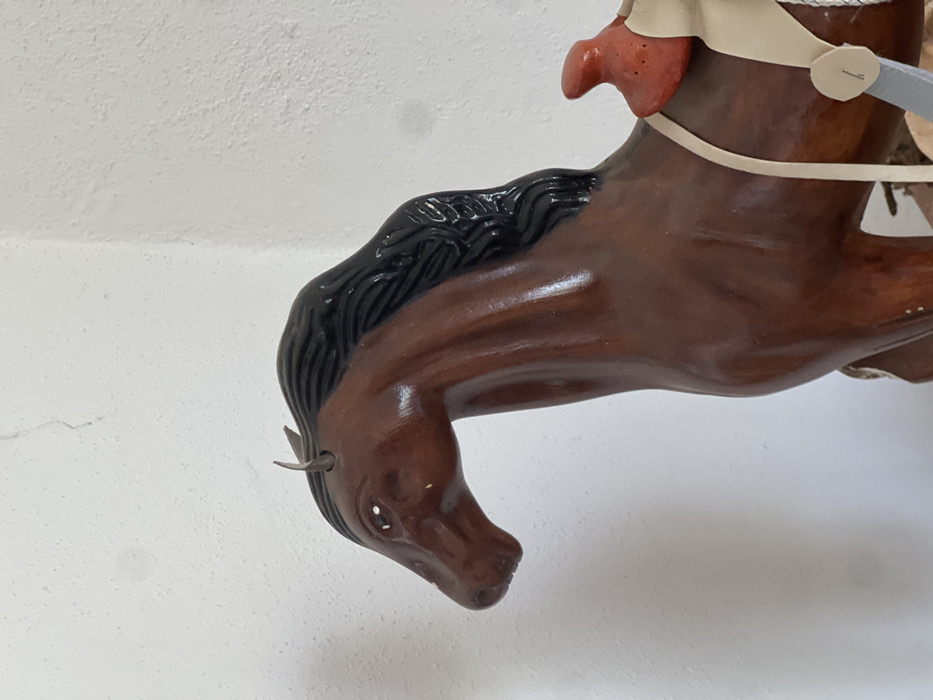 A close-up shot features the head and upper body of a brown rocking horse mounted against a white wall