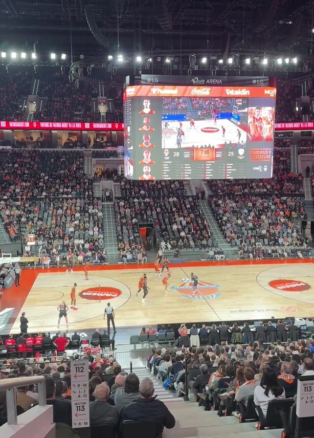 A wide shot depicts a packed basketball arena, with the Valencia Basket team in orange uniforms playing against the Anadolu Efes team in white. The game is ongoing, with the score displayed on a large screen hanging from the ceiling, which also shows player profiles. The court is surrounded by fans in the stands, mostly seated and focused on the game, although some are visible in the aisles. The scene has good lighting, and the camera angle is from an elevated position, capturing much of the venue. Section numbers are visible, indicating seating areas.