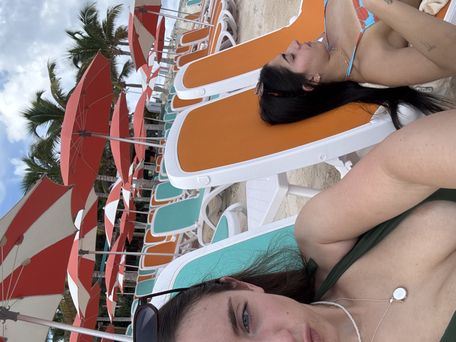 A daytime scene depicts a beach in the Berry Islands, Bahamas, with two women relaxing among rows of sun loungers and umbrellas. In the foreground, the left side of a woman's face, upper torso, and arm are visible; she has dark hair, blue eyes, and wears dark sunglasses on her head, a dark green bikini top, a white beaded necklace, and a silver locket. Her lips are slightly pursed, and she appears to be looking towards the camera while seated in a teal and white sun lounger. To her right, a second woman is shown in profile, facing right, with long dark hair, sunglasses on her head, and wearing a multi-colored bikini top. Her eyes are closed as she rests in an orange and white sun lounger. A small white plastic table stands between the two loungers. The background features numerous unoccupied sun loungers with white frames and alternating teal or orange fabric, arranged on light-colored sand. Many open beach umbrellas, primarily solid red or red and white striped, are scattered throughout the scene, providing shade. Palm trees are visible in the distant background under a partially cloudy sky.