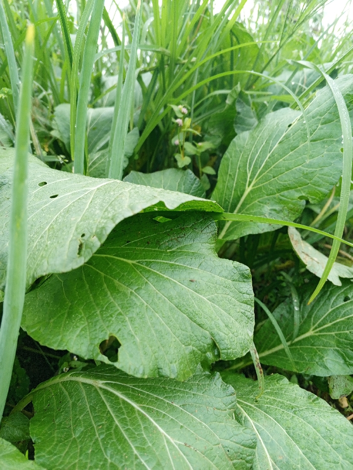 A close-up shot features vibrant green mustard greens and tall grasses. The large, textured leaves of the mustard greens dominate the foreground, displaying visible veins and subtle imperfections. Thin, upright blades of grass interspersed between the leaves add a sense of wildness. Hints of small white flowers are visible among the foliage. Dew or moisture droplets speckle the plant life, adding to the natural and fresh aesthetic.