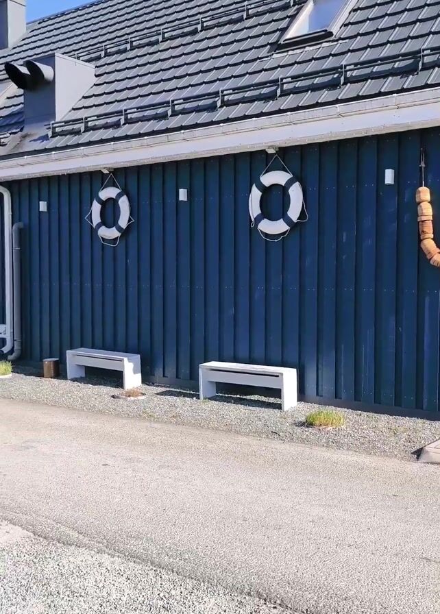The video pans left across the exterior of a navy blue building with nautical decor, including two life preservers