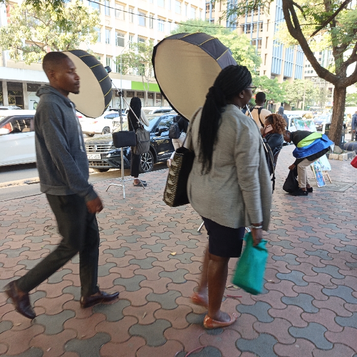 The image displays an urban street scene in Nairobi, Kenya. The foreground features a sidewalk paved with interlocking concrete pavers, colored in alternating red/orange and grey patterns. Two dark-skinned individuals are prominent: a male, wearing a grey hooded sweatshirt, dark trousers, and brown shoes, walks left in profile; a female, with long braided hair, wearing a grey cardigan, dark skirt, and orange-brown flat shoes, walks right, seen from behind/side, carrying a black and gold patterned shoulder bag and a bright green fabric bag. In the midground, a photography setup is visible, consisting of two large parabolic softboxes with black exteriors and gold/silver interiors, mounted on stands. Behind the softboxes, a black Volkswagen SUV, with a partial license plate reading "KDA 47L", is parked on the street. A person in dark clothing is partially visible near the vehicle and equipment. Further to the right in the midground, an individual dressed in light-colored pants and a blue/green jacket is bent over an arrangement of multiple colorful artworks, possibly paintings, displayed on easels or on the ground. The background consists of multi-story city buildings and trees lining the street, with additional parked vehicles and indistinct figures suggesting general urban activity.