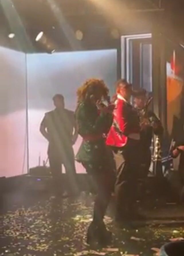 The scene unfolds on a brightly lit stage strewn with confetti, where a woman with curly brown hair, dressed in a green and sequined ensemble, holds a microphone and appears to be singing. She wears black tights and platform boots. To her right, individuals in red attire, potentially musicians, are partially visible. Another figure, clad in a black outfit, walks onto the stage carrying what resembles a baseball bat, while a woman in a dark blue dress with a sparkling silver skirt dances in the background. Additional figures stand in the background, some in dark suits, observing the performance. The backdrop features a display that includes a rectangular light structure. Overall, the scene seems to capture a live performance.