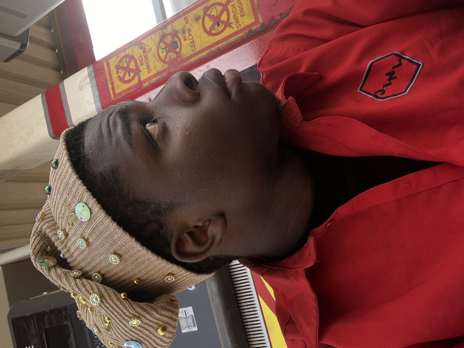 A dark-skinned individual, likely male, is captured in a close-up, side-profile image, looking upwards and to the right. The person wears a beige knitted beanie extensively decorated with numerous small, shiny embellishments including circular rhinestones, gold studs, and larger iridescent oval or teardrop-shaped pieces, one of which resembles a cross pendant. The individual is dressed in a red collared shirt, unbuttoned at the top, over a dark undershirt. An embroidered octagonal logo featuring the stylized letters "JINL" is present on the left chest of the red shirt. The background elements indicate a petrol station environment, including a red and white striped support pillar adorned with multiple yellow warning signs. These signs, visible on the pillar, prohibit "NO SMOKING," "NO CELLPHONE," and instruct to "SWITCH OFF ENGINE." A portion of a fuel dispenser with a digital display is partially visible behind the individual's head. This scene is identified as occurring at a JINL petrol station in Jos, Nigeria.