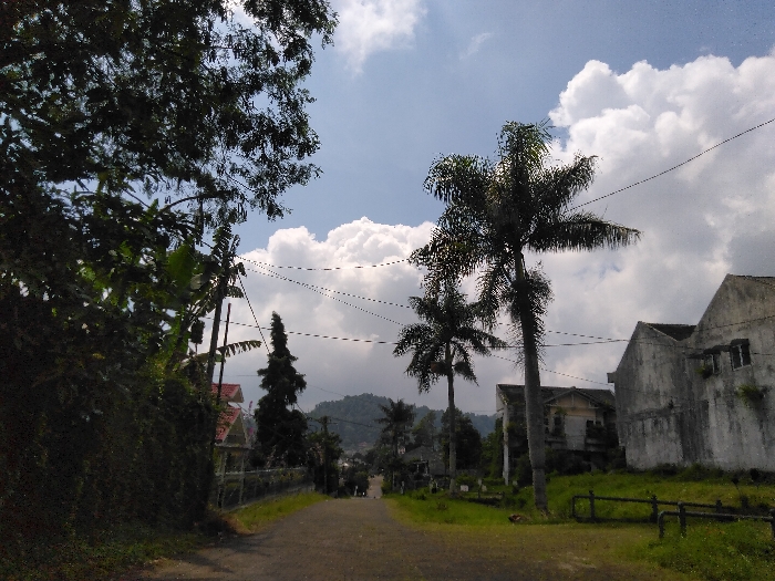 This image depicts a residential street scene in Nathene, Laos, under a partly cloudy sky. A narrow, downward-sloping paved road occupies the central foreground, curving slightly to the right in the distance. On the left side of the road, dense green foliage, including large-leafed plants and tree canopies, forms a verdant wall. A white fence is partially visible behind this vegetation further down the road, with a house featuring a reddish-orange roof visible beyond it. On the right side of the road, two tall palm trees with visible trunks stand prominently. Beyond them, two multi-story, neglected or abandoned buildings with weathered grey facades and gabled roofs are visible. The ground immediately to the right of the road is covered in green grass and some weeds. A low, dark-colored horizontal barrier or railing is present in the extreme right foreground. Utility lines, dark and thin, stretch horizontally across the middle and upper middle sections of the frame, connecting unseen poles. In the distant background, vegetated hills or mountains are visible beneath a sky featuring bright blue patches interspersed with large white cumulus clouds. No people, animals, or vehicles are present in the scene.