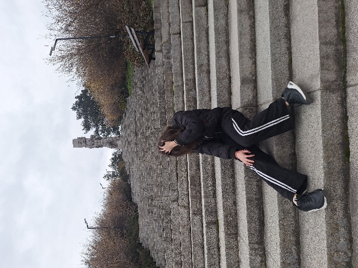 An individual is seated on the lower portion of a wide, multi-tiered stone staircase leading up to the April Uprising Memorial Complex in Panagyurishte, Bulgaria. The subject, appearing to be female, is wearing a black puffer jacket, black wide-leg track pants with two white stripes on each leg, and black sneakers with white soles. Her right hand is raised to her head, fingers in her long dark hair, partially obscuring her face, which is tilted downwards. A red bracelet is visible on her right wrist. The staircase, composed of gray stone blocks, ascends steeply towards a prominent, abstract block-like stone monument at its summit. Sparse, largely deciduous bushes and trees line both sides of the steps, indicating a non-summer season. Several modern streetlights with rectangular fixtures are positioned along the sides of the stairs. A dark-colored park bench is visible on the right side, partially obscured by vegetation. The sky is overcast and uniformly gray.