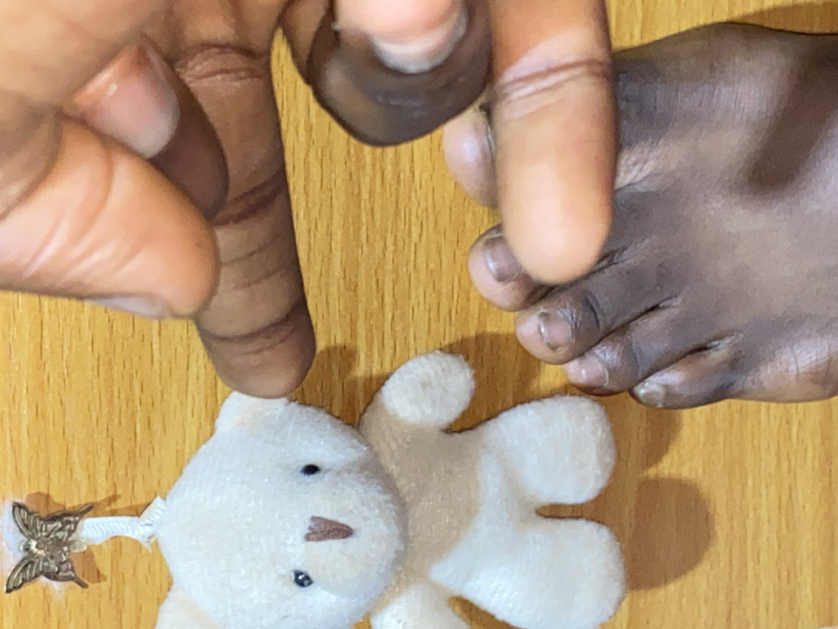 The scene, located in Bukuru, Nigeria, depicts a close-up view on a light brown wooden surface featuring horizontal grain lines. In the upper left quadrant, a small, off-white plush teddy bear is visible, possessing dark bead-like eyes and a light brown stitched nose. A small, bronze-toned metallic butterfly charm is attached to the teddy bear's head via a white fabric loop. To the right and lower on the wooden surface, a dark-toned human foot is partially visible, displaying five toes with unmanicured nails. Above the foot, multiple dark-toned human fingers are present, with one finger extended towards and making contact with the big toe of the foot. Shadows are cast, consistent with an overhead light source.