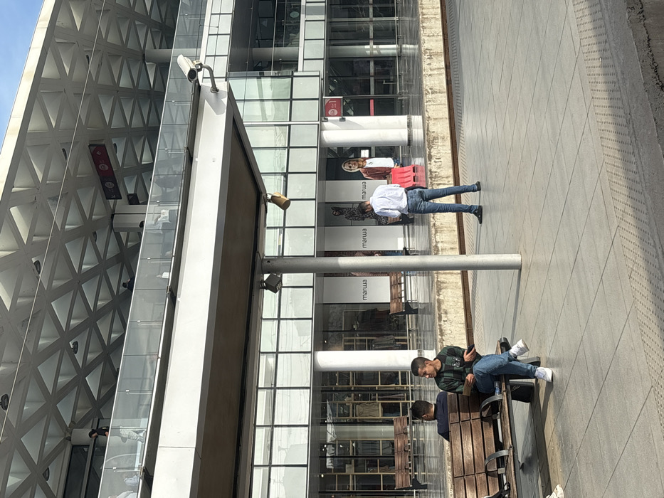 The image captures an outdoor concourse or platform within a modern multi-level transportation hub. In the immediate foreground, a grey tiled pavement with integrated tactile paving is visible. A prominent grey cylindrical metal pillar supports an overhead white canopy, which features recessed square light fixtures, a conical speaker, and a mounted white security camera facing right. Three males are present in the foreground. On the left, two males are seated on a wooden slatted bench. One, largely obscured, wears a dark shirt and faces away from the camera. The other, wearing a green and black plaid shirt, blue jeans, and white sneakers, is facing right and holding a small, light-colored object in his left hand and a dark object in his right. A third male stands on the right, facing away from the camera, wearing a light blue collared shirt, blue jeans, and dark shoes, appearing to be looking down at his hands. Behind the concourse is a raised concrete platform. The midground consists of the ground level of a modern building with extensive glass facades. Visible through the glass are multiple storefronts branded "marwa," displaying clothing on mannequins and racks, with a large poster of a woman in a red jacket prominently featured. White cylindrical pillars support the building's upper levels. The background shows an upper level of the building, featuring a glass-railed walkway or balcony where several indistinct individuals are present. Above this level, a distinctive white triangular grid-patterned roof structure is visible, along with red and white directional signs affixed to overhead beams. The scene is brightly lit by natural daylight.