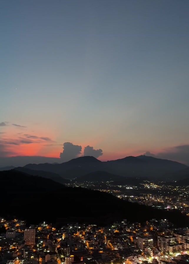 cityscape at twilight, with a horizon of silhouetted mountains. A thin band of orange is visible near the horizon, suggestive of a recent sunset. Numerous city lights shine below, giving the impression of a dense urban area. The sky transitions from a dark blue near the top of the frame to a reddish hue closer to the mountains. Several small clouds are visible on the horizon.