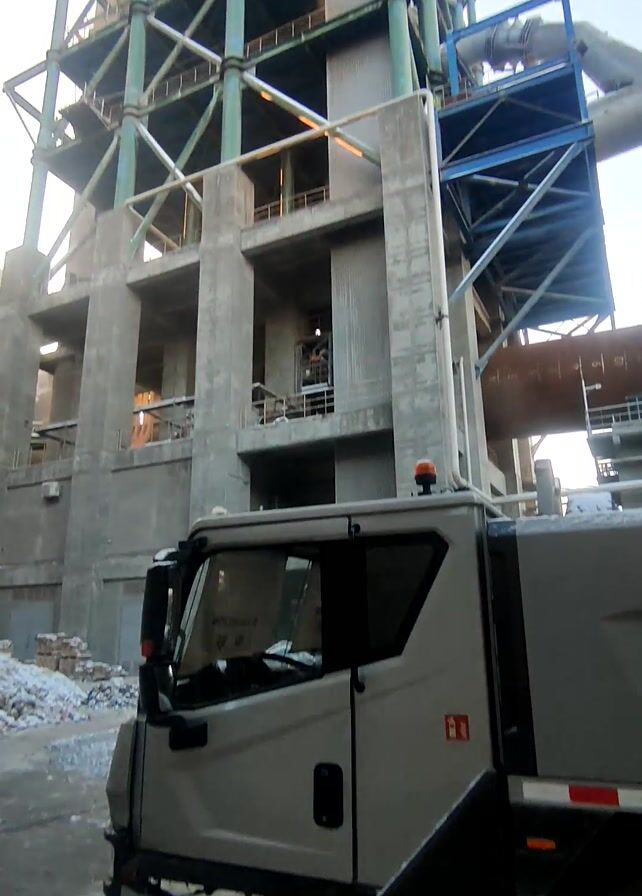 tall, unfinished industrial building with a lattice-like structure on its exterior. A gray utility vehicle is parked nearby. Construction workers are visible inside the building through open sections. A crane is operating in the background. The ground is concrete. The sky is visible above the building. The camera is angled upwards, capturing the height of the structure.