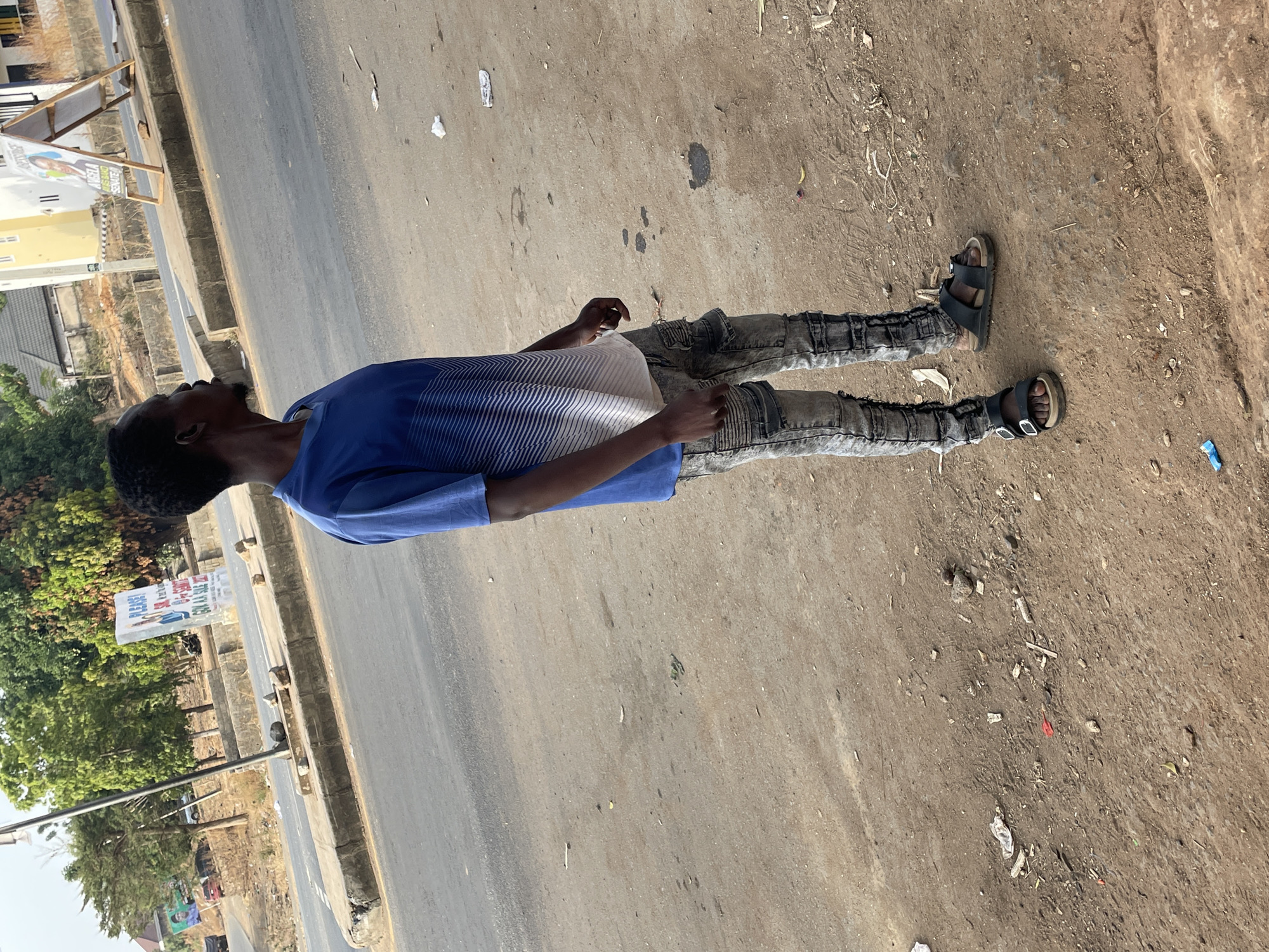 man standing on the side of a road. He is wearing a blue shirt, patterned jeans, and sandals. He is standing on the edge of a road in what appears to be a urban setting based on the buildings, the roads and the presence of the political billboard. Based on the prompt, it's Akwanga, Nigeria. The road is mostly gray, while the ground is brownish. There are trees and other vegetation in the background. The road and ground are littered with debris and small objects.
