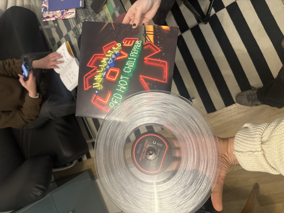 A vinyl record and its cover are displayed. The record is a clear translucent pressing of Red Hot Chili Peppers' "Unlimited Love" album. The album cover features a neon sign design with the album's title and band name. The record is held in a hand, while the album cover rests on a surface. A person with a phone is also in view, along with parts of a black and white striped rug and furniture.