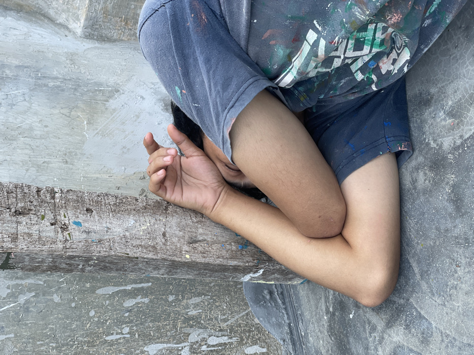 An individual lies on their right side on a dark grey concrete floor, resting against a weathered, vertically oriented wooden post and a light grey unfinished concrete wall. The person's face is obscured, turned away from the camera and partially covered by their right hand. They wear a dark grey short-sleeved t-shirt and dark blue shorts, both heavily stained with various colors of paint (e.g., blue, green, white, pink). The wooden post also shows blue paint splatters. The concrete wall in the background has a textured, unpainted finish with subtle paint marks, and a stepped concrete element is visible in the upper right. The environment appears to be a utilitarian or construction-related space. The specific location within Mns Asan, Indonesia, cannot be determined from the visual information provided.