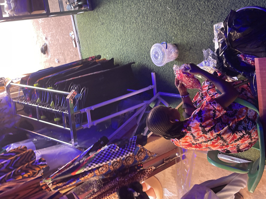 The image captures an indoor market stall in Samaru, Nigeria, with an outward view to an unpaved outdoor area