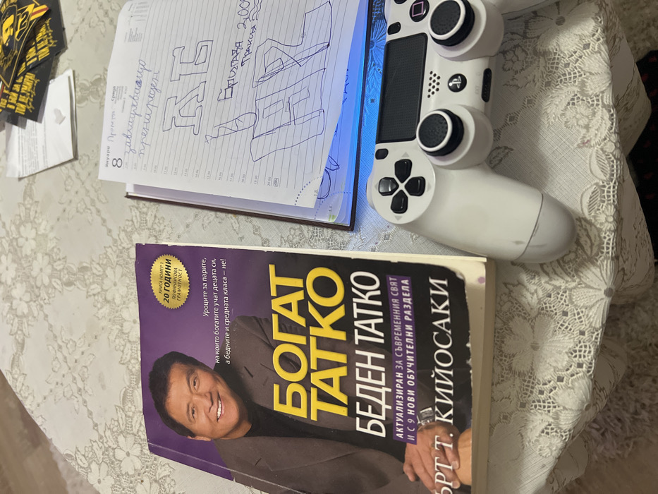 In an interior setting within the city of Sedlartsi, Bulgaria, an overhead shot captures a tabletop scene. The table is covered with a white, lace-patterned tablecloth featuring a floral motif. Positioned on the left side is an open copy of the book "Богат татко, беден татко" (Rich Dad Poor Dad) by Robert T. Kiyosaki, published in Bulgarian. The book's cover, predominantly purple, displays a smiling image of Robert Kiyosaki in a suit, alongside a gold-colored emblem stating "Книга номер 1 по финансова грамотност 20 години" (Book number 1 for financial literacy 20 years). The book shows signs of wear, including minor creasing on the spine and small discoloration marks on the bottom edge of the cover. To the right of the book, an open spiral-bound notebook or planner is visible. The open page is dated "8 Януари" (January 8) and indicates "Сряда" (Wednesday). Handwritten in blue ink at the top are the words "завършващо пренареден" (finishing rearranged). Below this, large, stylized block letters, appearing to form "КЕ" and "FIL," are drawn in blue ink. Further down, "Епизод 2000 Тракия" (Episode 2000 Thracian/Thrace) is written. A faint blue glow is reflected on the lower portion of the page. To the immediate right of the notebook, a white PlayStation DualShock 4 controller is present. Its joysticks, D-pad, and face buttons are visible, and the controller appears to be in functional condition with minor surface marks. In the upper right background, several loose papers are scattered. One small piece appears to be a note with a hand-drawn heart. Another larger, darker piece of paper or sticker features yellow/gold text, including "ТОЙ НЕ УМРЯ!" (He didn't die!) and "Тракия" (Thrace). The scene is illuminated by an even, ambient light source, and no individuals or active interactions are depicted.