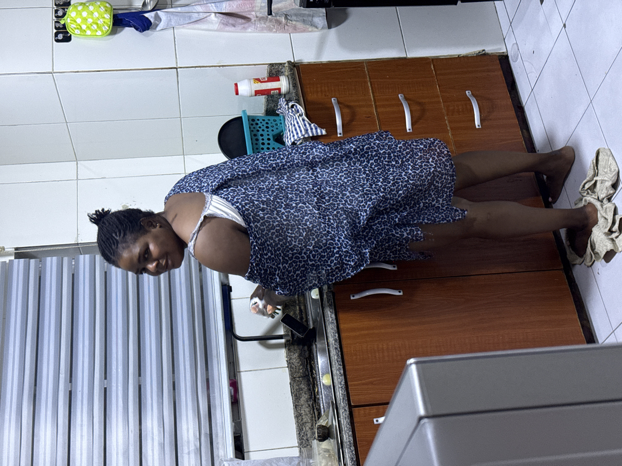 The image depicts a kitchen scene in a residential setting within the city of Alaguntan, Nigeria. A female subject, of apparent African descent, stands facing away from the viewer, angled towards a double basin kitchen sink, but turns her head and upper torso to look directly at the camera with a subtle smile. She has dark braided hair tied back in a bun and is barefoot. She wears a white bra under a sheer, patterned blue and black garment, draped off her right shoulder. Her right hand is positioned in the left sink basin, holding a white scrubbing implement. The kitchen features white tiled walls and a gray, speckled countertop. Above the sink, a window is covered by horizontal white and gray Venetian blinds. A black faucet is centered between the two sink basins. Within the left sink basin, two yellowish, oval-shaped items, possibly potatoes or lemons, are visible. A dark-colored smartphone stands upright on the countertop near the faucet. To the right of the subject, on the countertop, a teal blue plastic basket contains dark items, and a folded blue and white striped cloth rests beside it. A white plastic bottle with red labeling stands nearby. The wall to the right features small decorative hooks from which a green polka-dot oven mitt and a white and blue towel are suspended. Below the countertop, brown wooden cabinets with silver handles are visible. The floor is covered with white tiles, and a crumpled beige cloth lies near the subject's feet. The lower left foreground shows the partial metallic gray casing of an appliance, possibly a microwave or oven.
