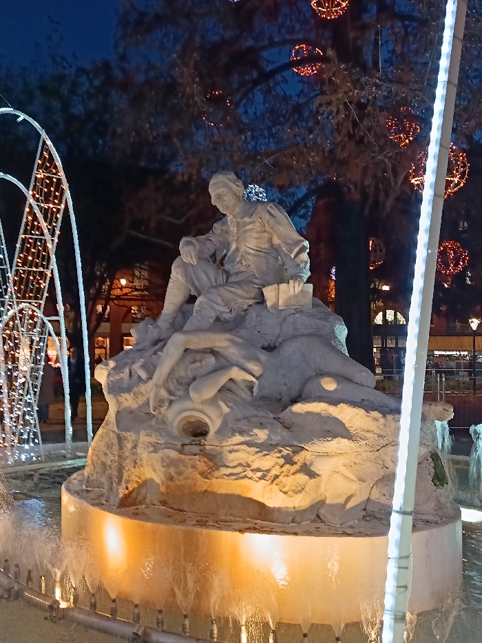 - "At night, a white stone fountain features a seated statue of a man holding a book, positioned above another figure" by FM-Fezcd2, licensed under CC BY 4.0