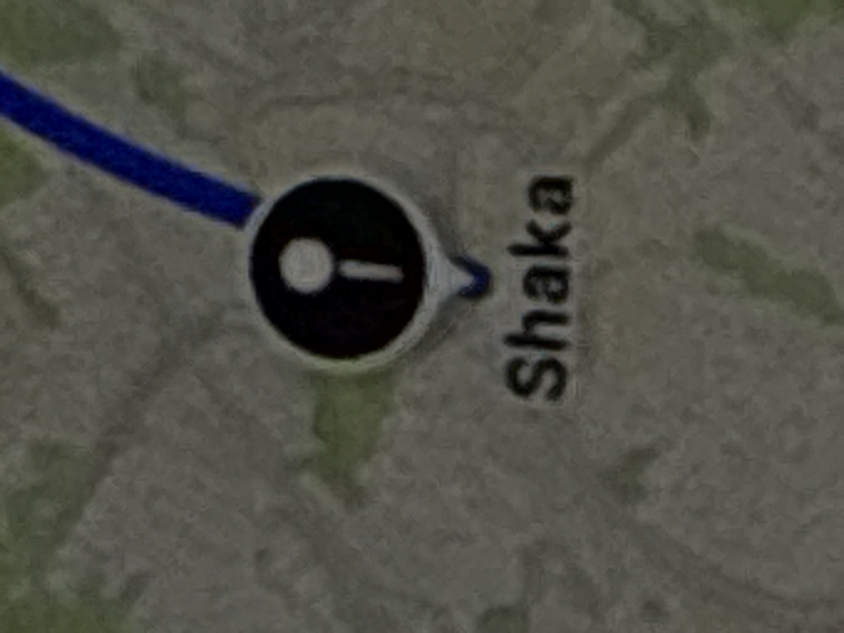 The image presents a close-up view of a digital map interface. Dominating the frame is a location marker, depicted as a black circle with a white "i" symbol inside, indicating an information point. A blue line, likely representing a route or pathway, approaches the marker from the upper left. To the right of the marker, the word "Shaka" is written in sans-serif font, labeling the location. The background has a textured, map-like appearance, suggesting a topographical view.