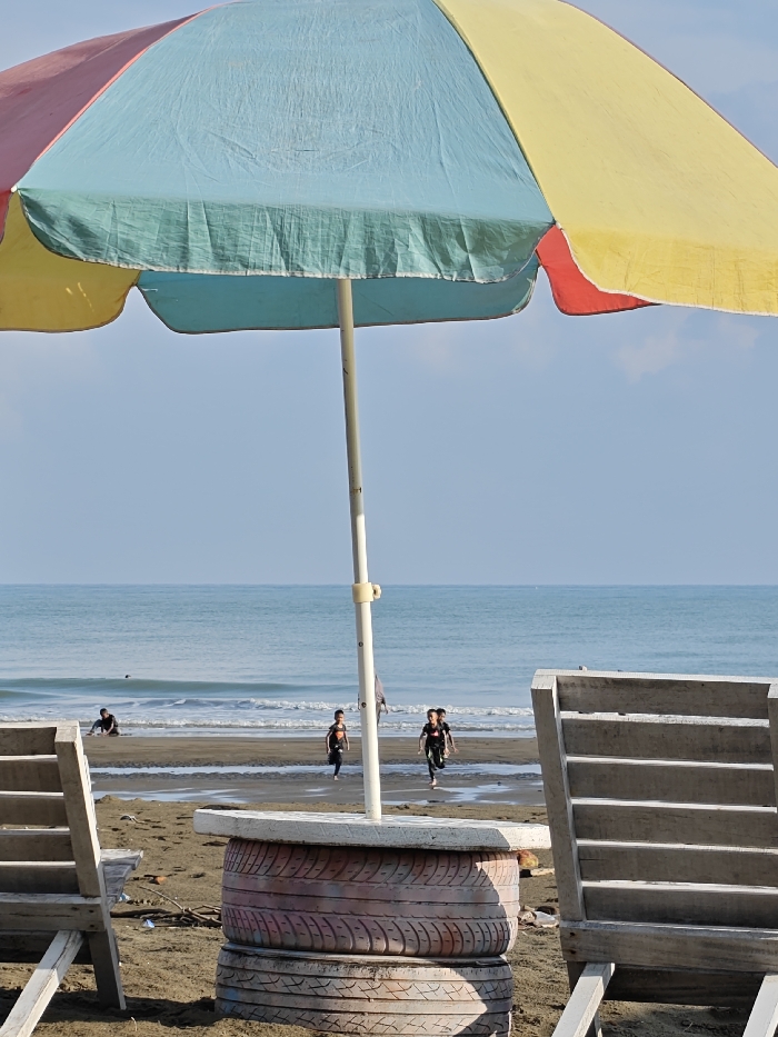 A beach scene in Reudeuep, Indonesia, is observed under a clear, light blue sky. In the foreground, a large beach umbrella with panels of blue, yellow, and red extends across the top of the frame. Its central white pole is anchored by a base constructed from stacked, painted tires, serving as a table. To the far left and right, parts of two light-colored wooden beach chairs or loungers are visible. Beyond the umbrella's shade, the sandy beach slopes gently towards the ocean. Three individuals, appearing to be children, dressed in dark clothing, are running from left to right across the wet sand near the water's edge. Further to the left, another individual is positioned low to the ground near the breaking waves. The calm blue ocean extends to the horizon, exhibiting gentle whitecaps near the shore.