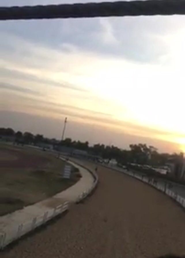 n elevated view of a horse racing track at sunset. The track is sandy and enclosed by a white fence. On one side is a grass field with a running track. In the distance, buildings and trees are visible. A thick cable is in the foreground at the top of the frame. A head appears at the bottom of the frame.