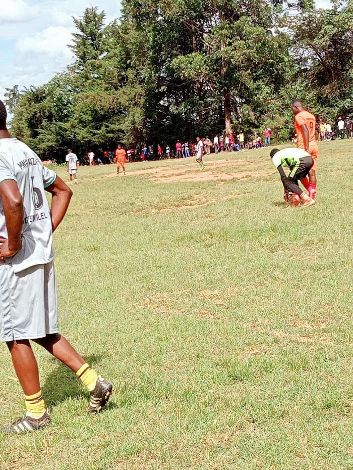 The scene depicts an outdoor soccer (football) event in Ngenyilel ward, Kenya