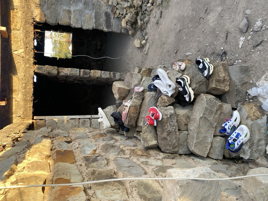 A stone structure with dark window openings displays a collection of shoes strewn on a pile of rocks