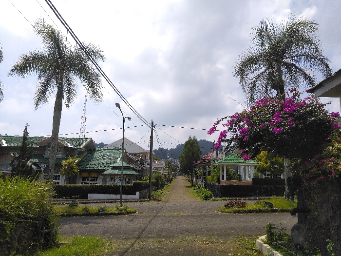 This static, outdoor image depicts a residential street scene in Emmerich on the Rhine, Germany, under a partly cloudy sky during daylight. The foreground features a dark, unlined paved road that diverges into two paths, flanked by green grass and low-lying shrubs. A concrete curb is visible on the bottom right. In the midground, residential houses line both sides of the street. These structures feature distinctive green-tiled roofs and predominantly white or light-colored walls. Several properties include small, ornate gazebos or covered porch areas with matching green roofing. Two tall palm trees are prominent, one on the left and one on the right, partially obscured by a large bougainvillea bush displaying numerous vibrant purple flowers. A black metallic street light pole, equipped with a single lamp, stands centrally within the street area. Multiple black power lines are strung overhead, traversing the upper portion of the frame. The background reveals additional residential buildings and distant hills or mountains covered in dense green foliage. A tall, lattice-style communication tower is partially visible behind the left palm tree. No individuals or discernible activities are present within the scene.