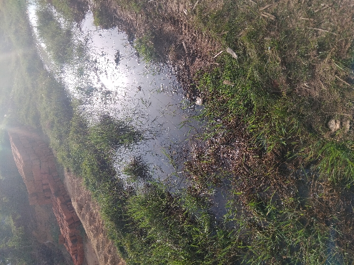 A narrow stream of water cuts through a grassy bank, reflecting the sky. One side reveals layers of reddish-brown earth and brick-like material. The grass along the edges is lush and green, contrasting with drier patches. The water surface glistens, catching the sunlight. Overall, the scene suggests a natural waterway bordered by diverse vegetation and earth formations.