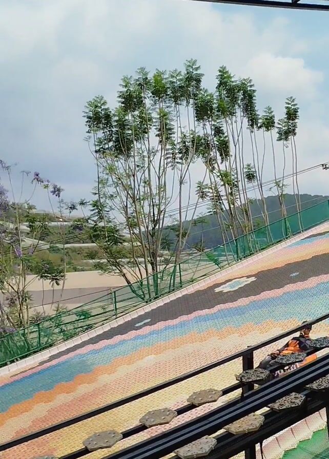 A person is sliding down a rainbow-colored track in an orange inflatable tube. The track is made of interlocking pieces. The person is wearing dark clothing and is lying on their back in the tube. The camera is positioned under a clear glass or plastic roof, looking out at the track and the surrounding landscape, which includes trees and a green hillside. The video is somewhat shaky, likely due to the movement of the ride. The sky is visible in the background.