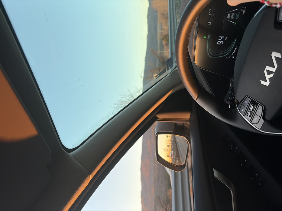 - "The image depicts the interior of a moving Kia vehicle, specifically from the driver's perspective, during the golden hour, likely in the vicinity of Vladaya, Bulgaria" by FM-R7RZz2, licensed under CC BY 4.0