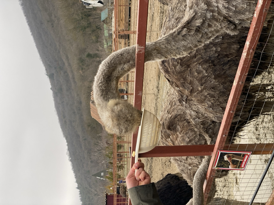 The image displays an outdoor ostrich enclosure situated in Терновский округ, Ukraine