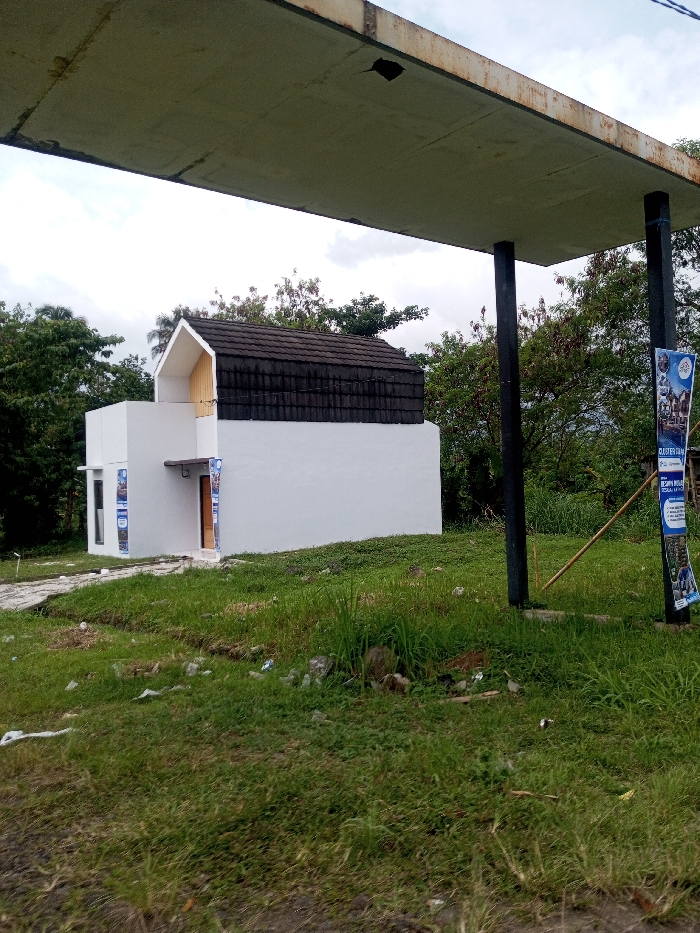The image displays an outdoor scene in Khajuripada, India, featuring a small, newly constructed or recently completed single-story house situated in a grassy, undeveloped area under an overcast sky. In the foreground, a large, rectangular concrete canopy, appearing weathered with visible cracks and a dark, irregular hole on its underside, extends across the top of the frame. This canopy is supported by two dark, square-sectioned pillars on the right side. A vertical blue and white promotional banner, displaying images of houses and text including "CLUSTER TRAM" and "DESAIN MEWAH," is attached to the rightmost pillar. Two light-colored wooden poles lean against this pillar and the ground. The house, positioned slightly left of center, features white-painted walls. Its roof structure consists of a dark, steeply pitched section on the right and a white gabled section above the main entrance on the left. The entrance includes a brown door and a small overhead canopy. A tall, narrow window on the front left facade of the house is adorned with additional promotional stickers. A narrow, light-colored path, possibly concrete, leads from the foreground towards the house's entrance. The ground is covered with green grass and weeds, with scattered litter, including plastic debris, visible throughout the foreground. Dense green trees and bushes comprise the background foliage, extending behind the house and to the right. No individuals or animals are visible in the scene.