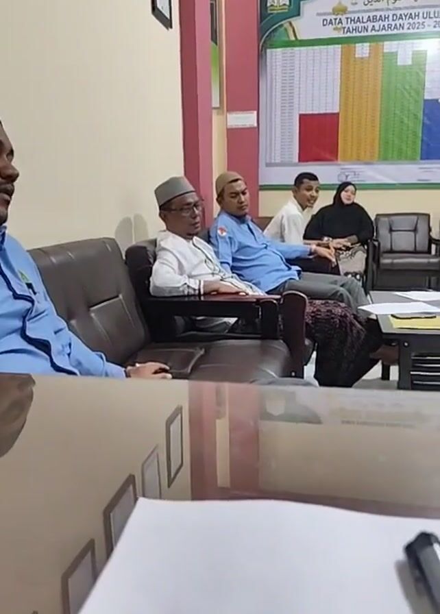 meeting taking place in a room with multiple individuals. There are five people visible, seated on couches and chairs. Most of them are wearing religious attire including head coverings, and casual or professional clothing. A table is in front of the couch where some of the individuals are seated, and it has papers and possibly a document on it. In the background, there is a large chart hanging on the wall, displaying data labeled "DATA THALABAH DAYAH ULUMUDDIN TAHUN AJARAN 2025-2026". There is a desk in the background, and another chair on the left. The meeting participants appear to be engaged in a discussion. The camera is positioned behind a table with a partially visible document on it, providing a view of the entire group from the front.