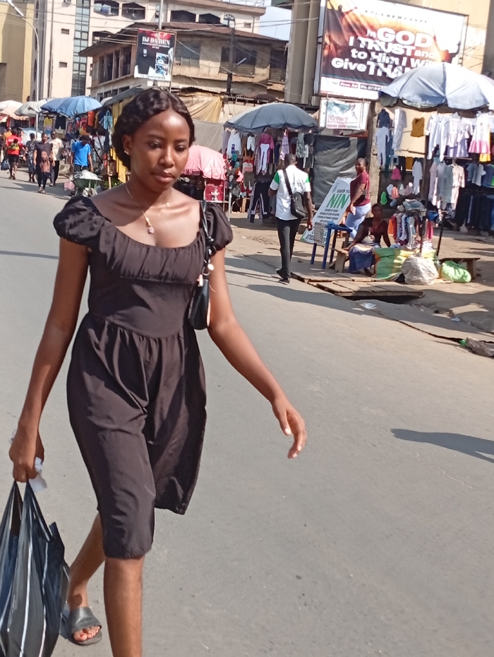 A young woman with dark hair and a black dress walks on a street. She carries a black plastic bag. Behind her, vendors sell clothing under umbrellas. People move about in the background. A large billboard with religious text is visible above the stalls. A building with multiple windows is located further back. The scene is brightly lit by sunlight.