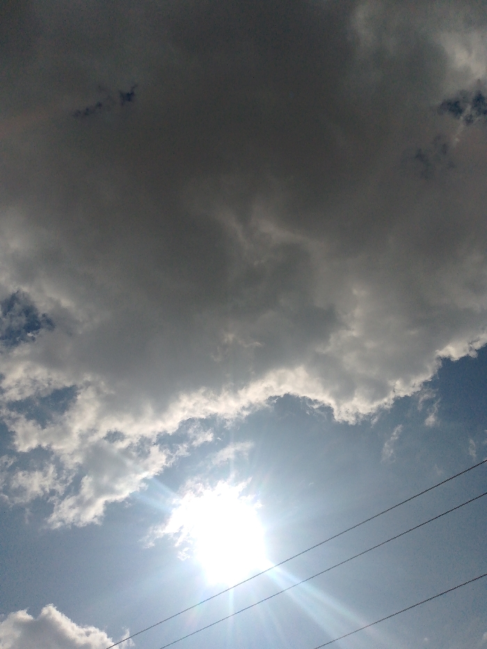 The image captures a partly cloudy sky with the sun shining brightly. A large, dark cloud formation dominates the upper portion of the frame, contrasting with the brighter, lighter clouds below. The sun is positioned lower, partially obscured by the clouds, yet its rays stream out. Power lines are visible in the lower right corner.