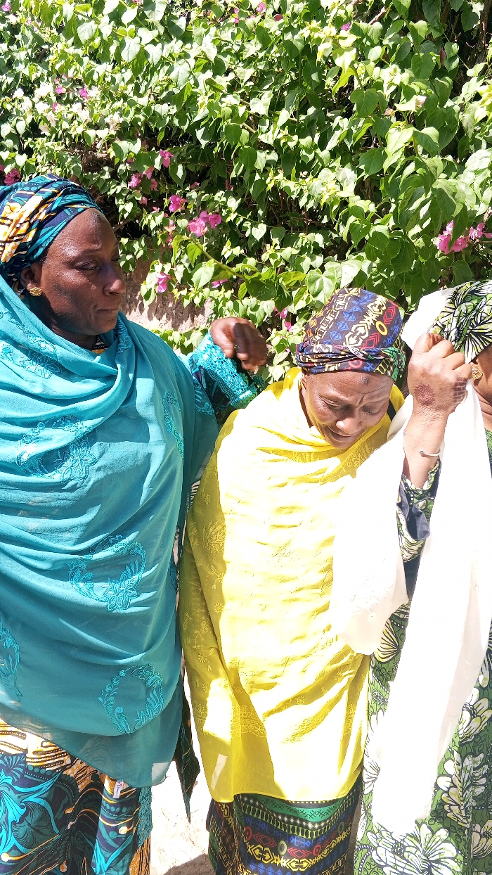 The image displays three adult females standing outdoors in front of a wall covered by dense green foliage with scattered pink flowers, in Unknown, Unknown. The woman on the left wears a multi-colored patterned headwrap and a turquoise sheer garment with embroidered patterns over a dark patterned skirt. She has a gold-colored earring and looks to her right. Her right hand is positioned on the upper back or shoulder of the central woman. The central woman wears a multi-colored patterned headwrap and a yellow sheer garment, with her head bowed and gaze directed downwards. The woman on the right is partially visible, wearing a white sheer garment over a green and white patterned fabric. Her left hand is visible, showing intricate dark patterns, possibly henna, and a silver-colored bracelet on her wrist. All three individuals are positioned in close proximity under bright sunlight.