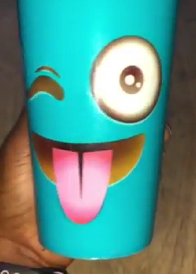 A person's hand holds a light blue plastic cup decorated with a winking face emoji sticking out its tongue with a bead of sweat