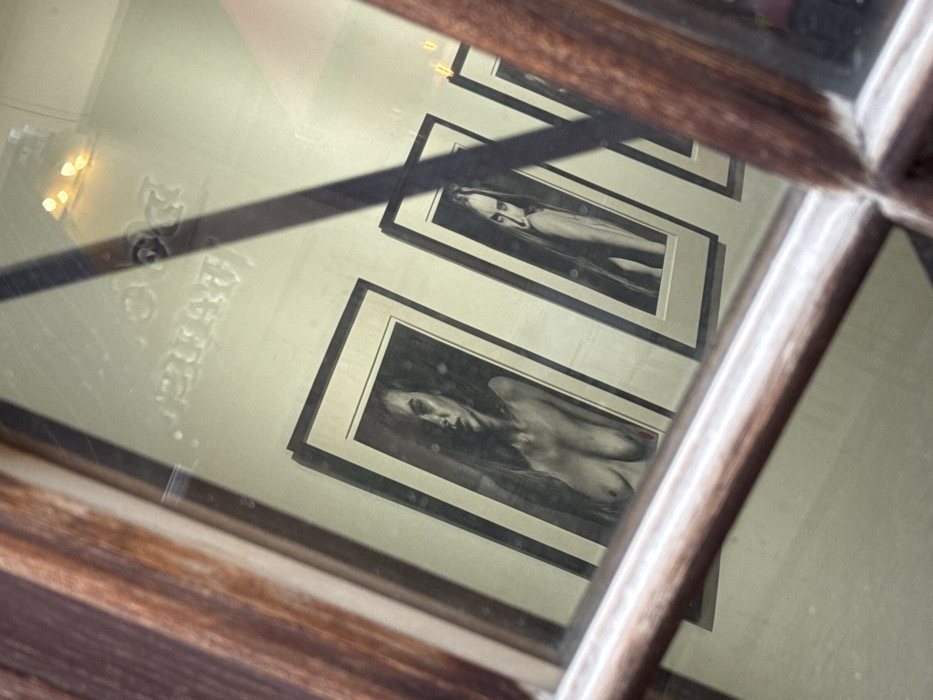 The image depicts an interior art gallery space in Lviv, Ukraine, viewed through a grimy window with a dark brown wooden frame. The window glass exhibits reflections, including faint, inverted text (appearing as "KYIV") and several interior ceiling lights, along with minor smudges and scratches. Inside, three framed, monochromatic portrait drawings of women are displayed on a light-colored wall. The leftmost drawing shows a woman from the chest up, facing forward, with long hair and bare breasts. A small red mark or signature is visible near the bottom left of this frame. The central drawing similarly portrays a woman from the chest up, with long hair, seen looking over her shoulder, also revealing her bare upper torso, with a comparable red mark in the lower left. A third, partially obscured framed drawing is visible to the right.